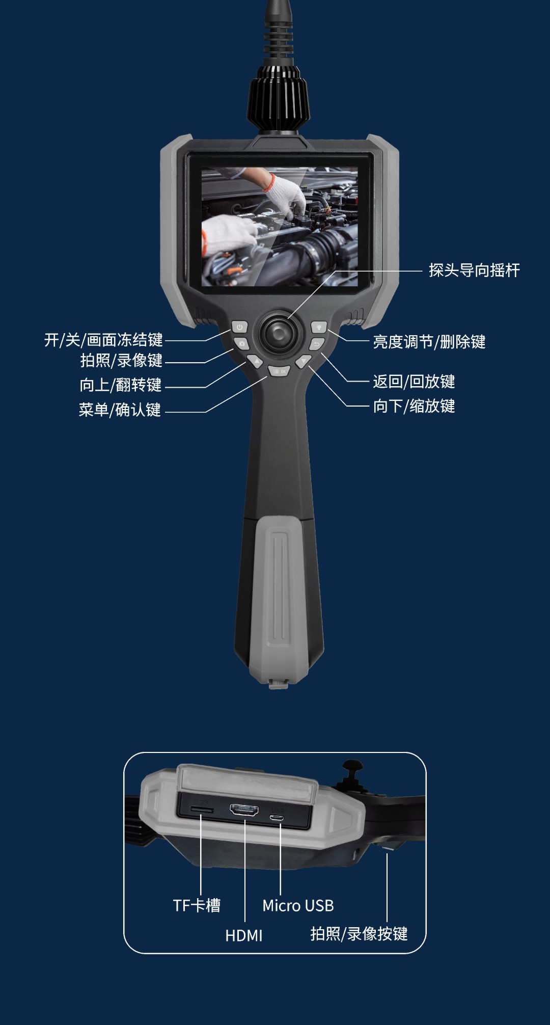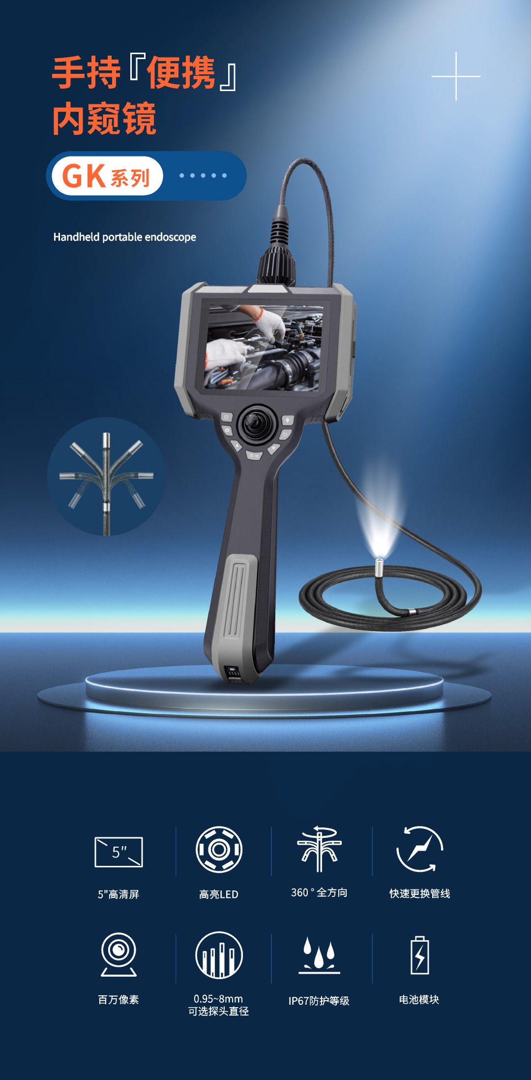 優(yōu)勢(shì)特點(diǎn):百萬(wàn)高清像素,前置高亮燈,快速更換管線,5英寸大屏